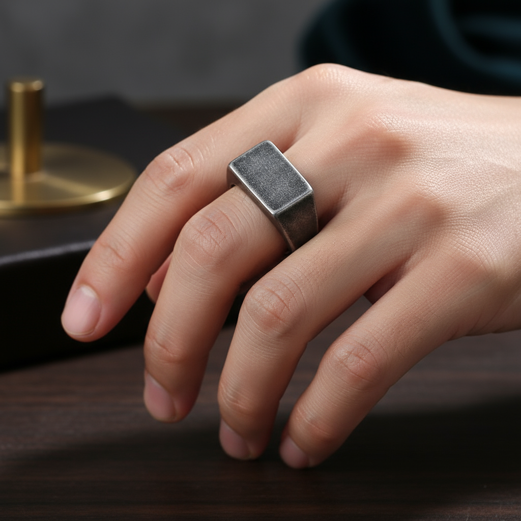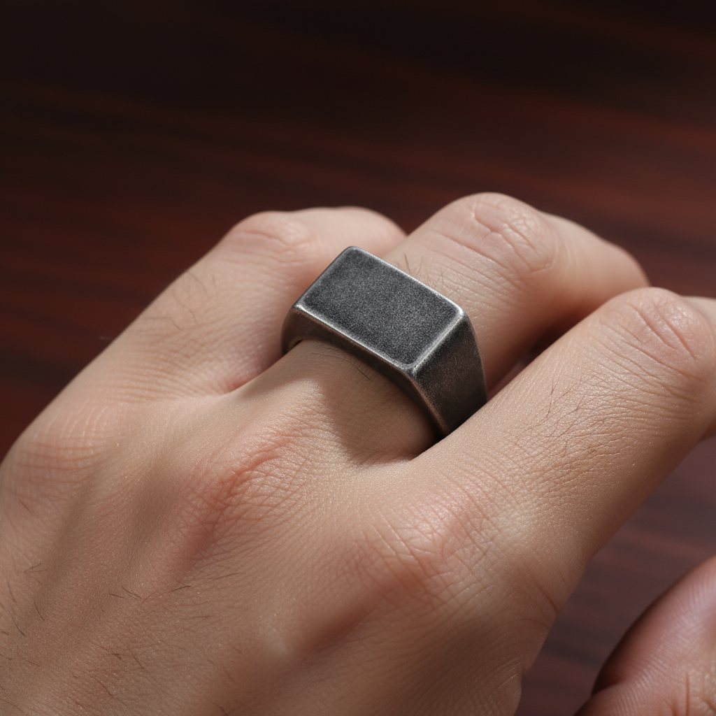 - Diseño: Anillo de sello con una placa rectangular texturizada y acabado envejecido.