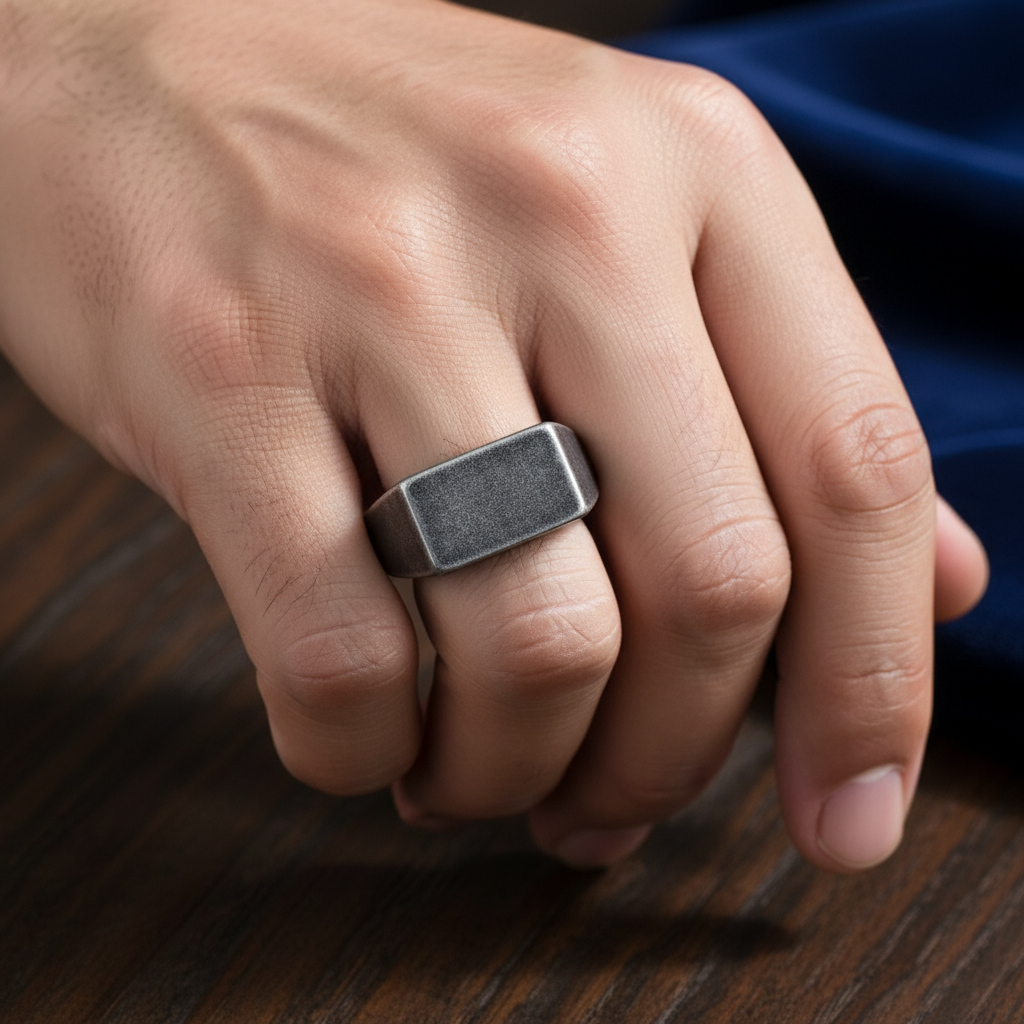 Destaca con este anillo de sello de diseño audaz y masculino. Fabricado en acero inoxidable con un acabado oxidado y texturizado, su gran superficie cuadrada y su peso robusto le dan un toque vintage y rebelde. Es el accesorio perfecto para complementar un look de estilo punk, gótico o casual.