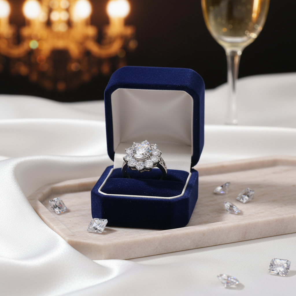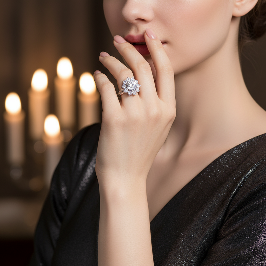 - Diseño: Anillo con zircón central y halo floral de piedras.