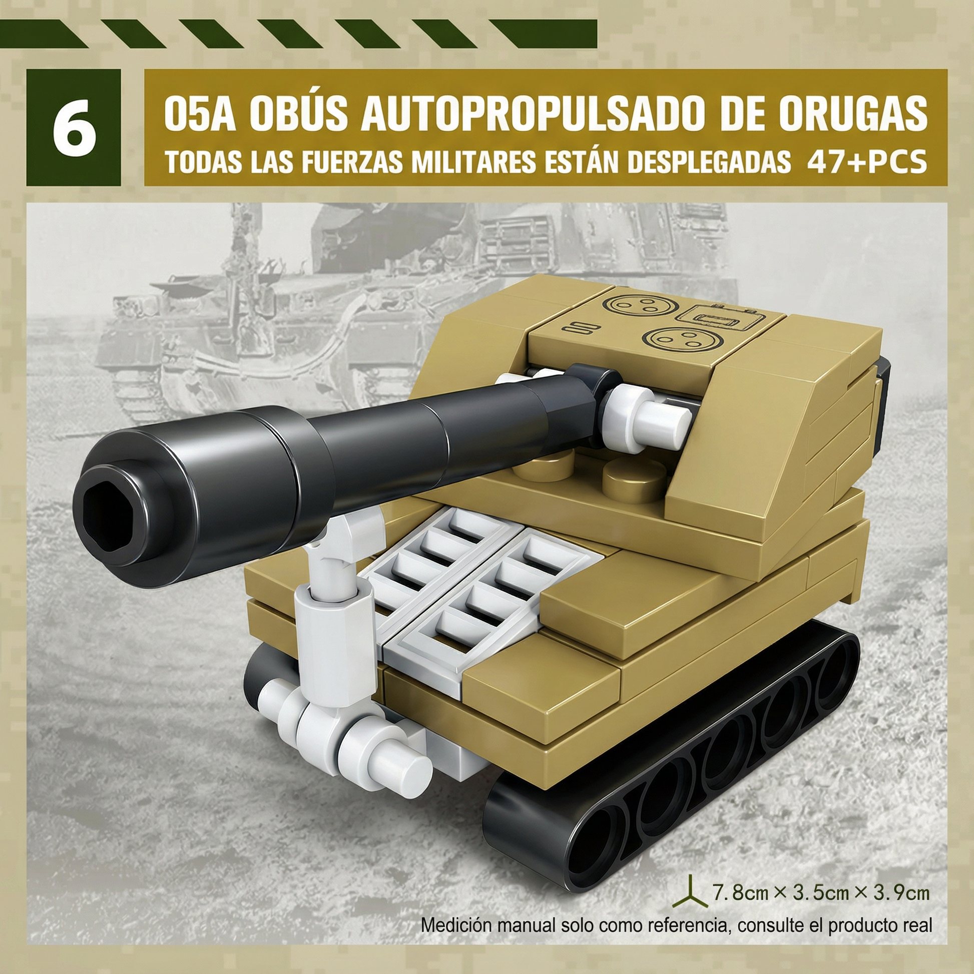 Si coleccionas los 8 sets militares (Tanque, Helicóptero, Caza, Barco, Misiles, etc.), podrás combinar todas sus piezas para construir la MAQUINA SUPREMA: