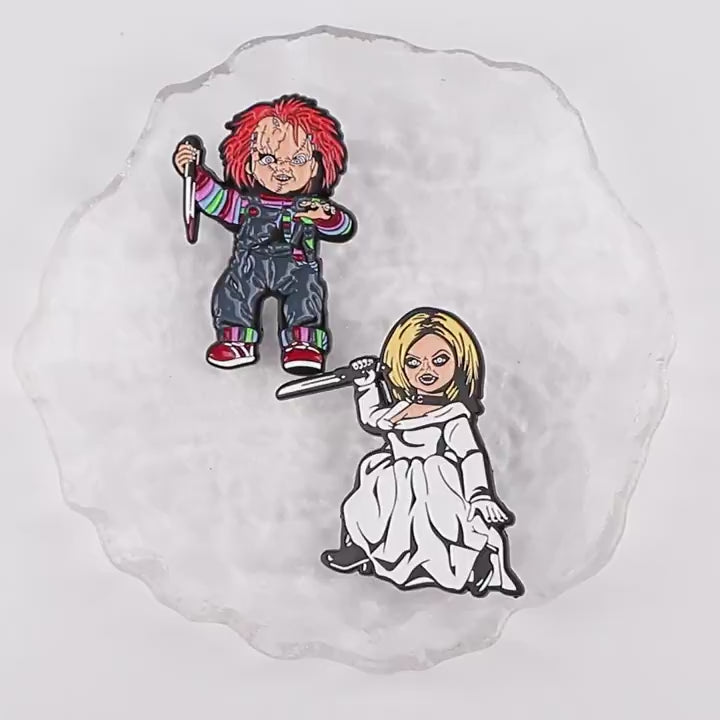 ¡Qué increíble pin de Chucky! 🔪 Este diseño captura a la perfección al icónico muñeco asesino de la saga de Child's Play, con su rostro cosido y un cuchillo en la mano. Es el accesorio ideal para cualquier fanático del cine de terror que quiera llevar un toque de caos a su estilo. ¡El acabado y los detalles son fantásticos! ✨