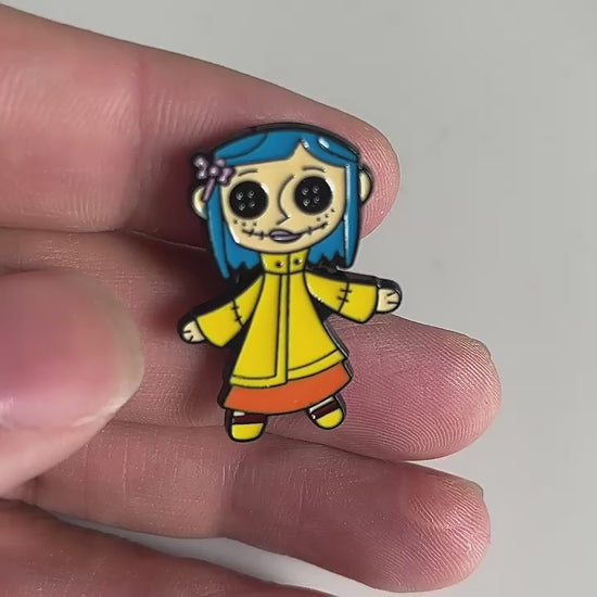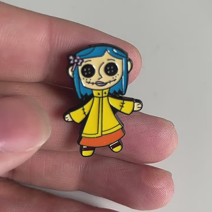 ¡Qué increíble pin de la muñeca de Coraline! 🪡 Este diseño captura a la perfección la escalofriante réplica que usa la Otra Madre para espiar a la verdadera Coraline. Es el accesorio ideal para cualquier fanático que quiera llevar un recuerdo de la película, con su característico cabello azul y sus ojos de botón. ✨