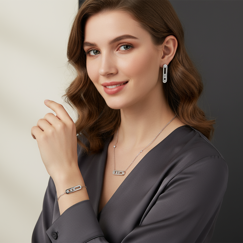 Cada pieza está fabricada en acero inoxidable de alta calidad, un material conocido por su resistencia, durabilidad y brillo que perdura en el tiempo. El diseño central presenta una estilizada barra, adornada con brillantes circonias transparentes, que capturan la luz de manera deslumbrante. ✨